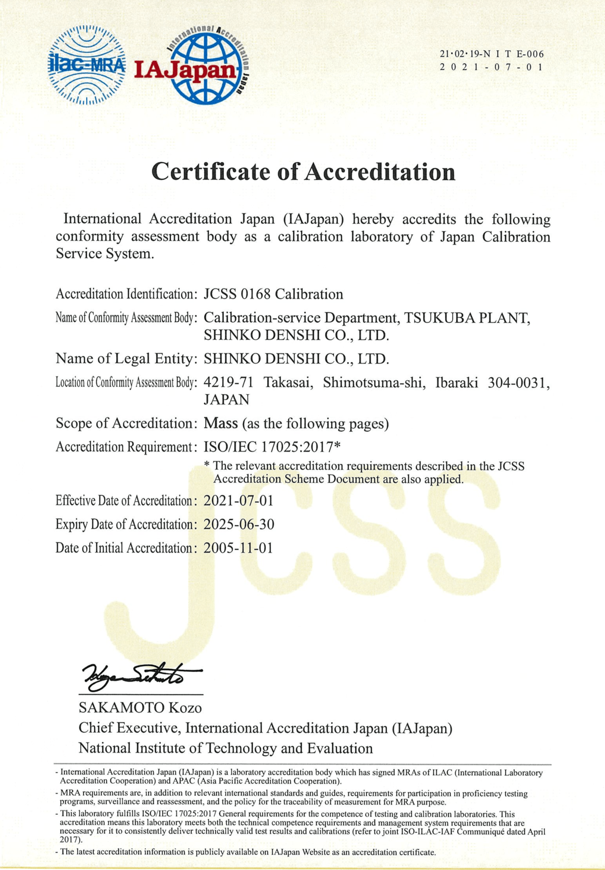 新光電子は、JCSS の登録区分「質量(はかり)」の校正事業者として登録されています。